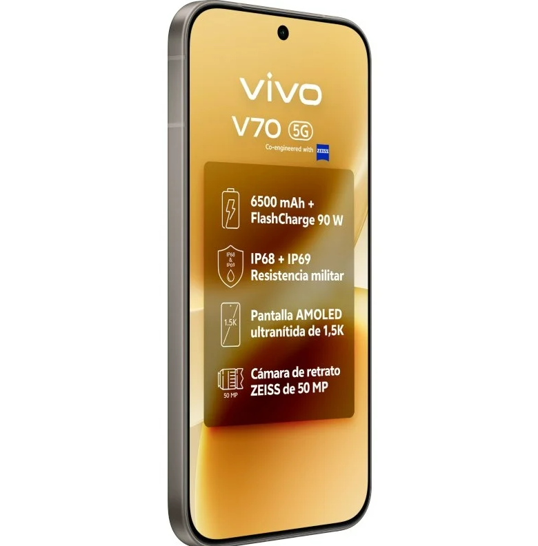 V70 / 6,59" AMOLED 120 Hz / Snapdragon 7 Gen 4 / 8GB + 512GB / Cámaras ZEISS 50 MP / 6500 mAh / 90 W / Android 16
